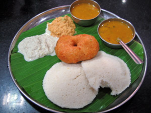 We eat meals only by hand in South India. Banana leaves are used as a plate. Rice is the most popular food.